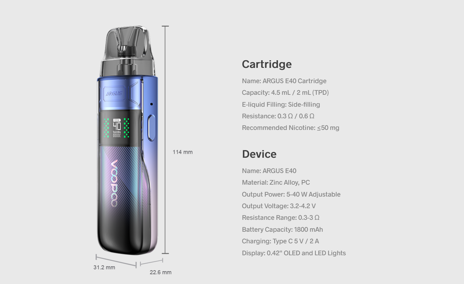 Тип зарядки - USB Type-CСовместим с картриджами Voopoo ARGUS Pod 0.7ohm и 1.2ohm, также совместим с картриджем пустым Voopoo ARGUS Pod, который совмещается с испарителями Voopoo ITO.Совместим с картриджами Argus E40 и с картриджами пустыми PnP X(совмещаются с PnP X Coils).